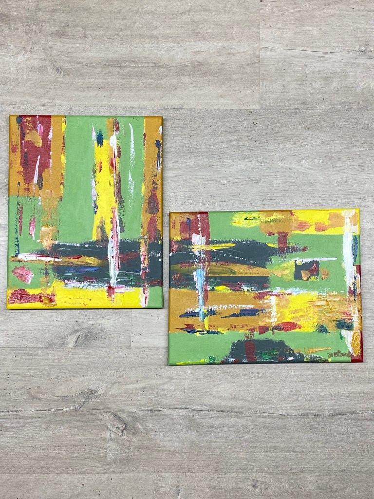 Abstract werk, variatie in kleurenwerk, handgemaakt, geschilderd op Canvasdoek, afmetingen 300 x 240, 2 delig: Verticaal – Horizontaal