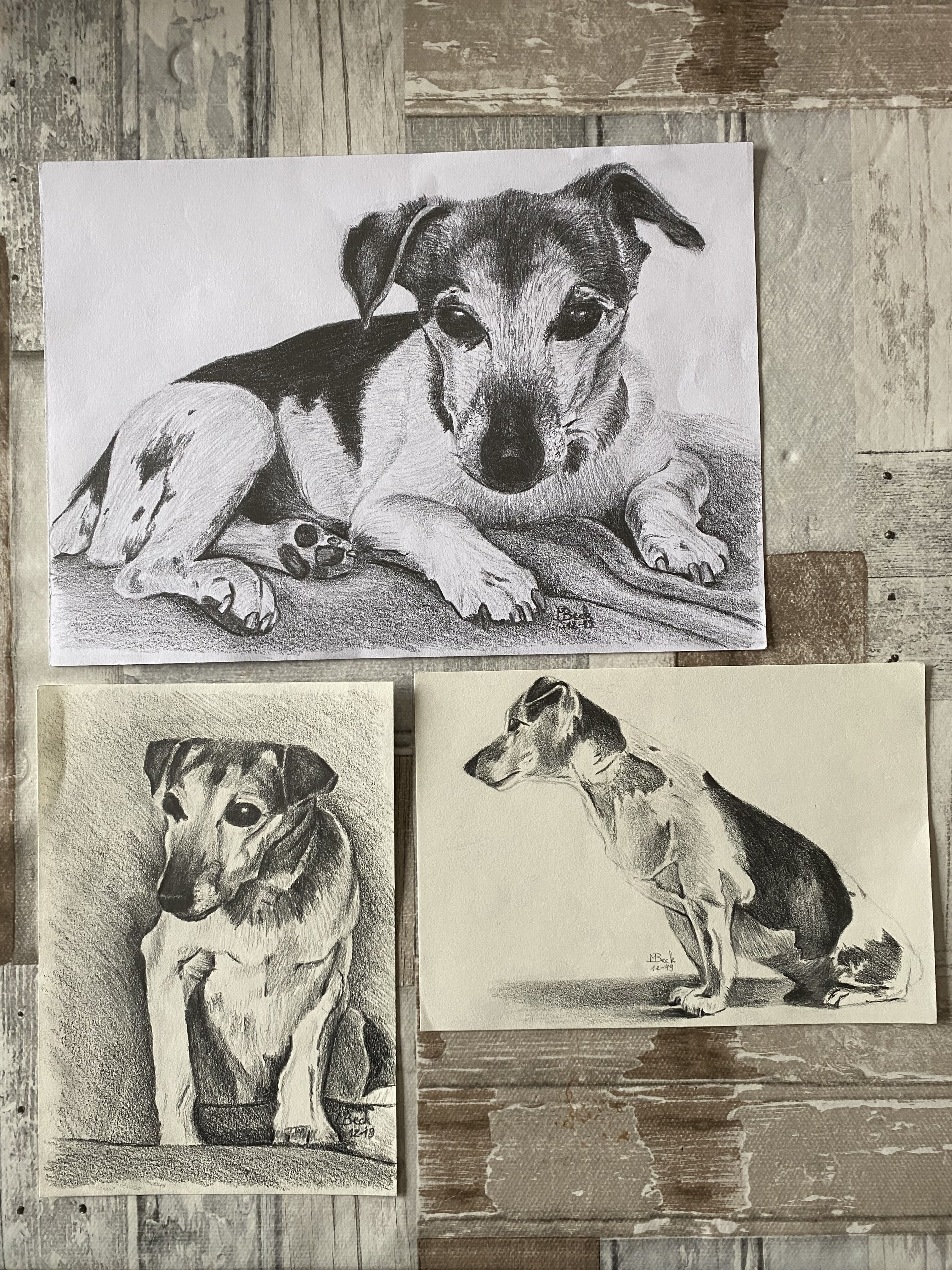 Getekend in potlood, op A4 formaat en 2 tekeningen op A5 formaat.